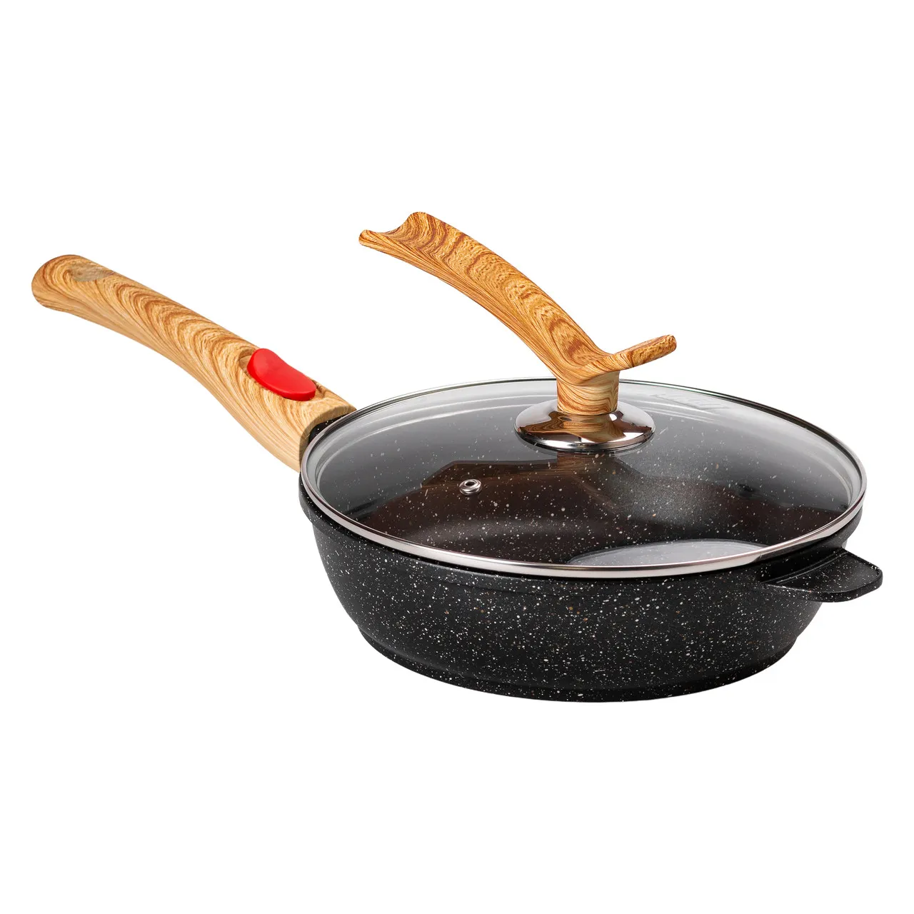 Матеріал виготовлення — алюміній, відомий своєю легкістю та хорошою теплопровідністю. Антипригарне покриття безпечне для здоров’я та не містить шкідливих сполук, виключаючи прилипання їжі та полегшуючи процес миття. Кришка виконана з жаростійкого скла, що дозволяє контролювати процес приготування без зняття кришки.