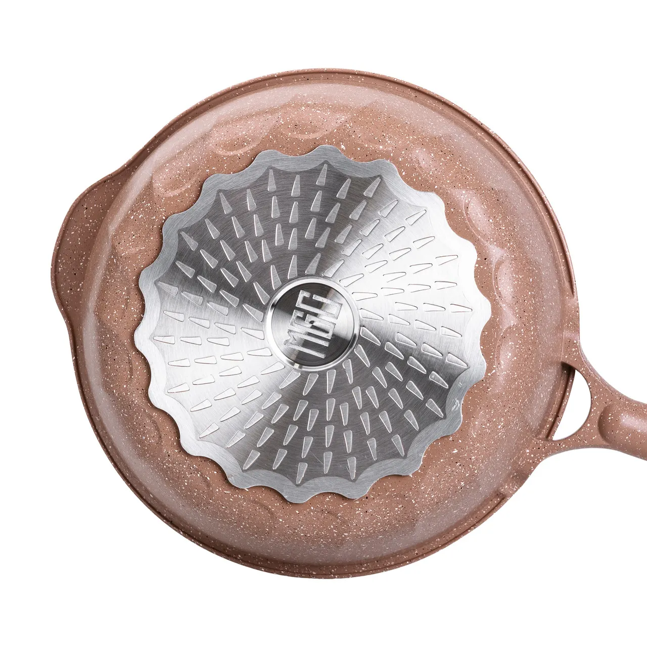Наявність отвору в кришці для виходу пари дає змогу регулювати ступінь пароутворення всередині посудини, що особливо важливо при приготуванні тушкованих і томлених страв. Це сприяє збереженню аромату та текстури продуктів.