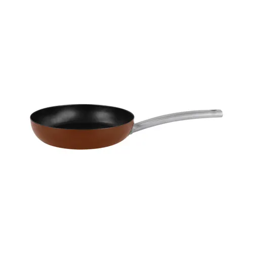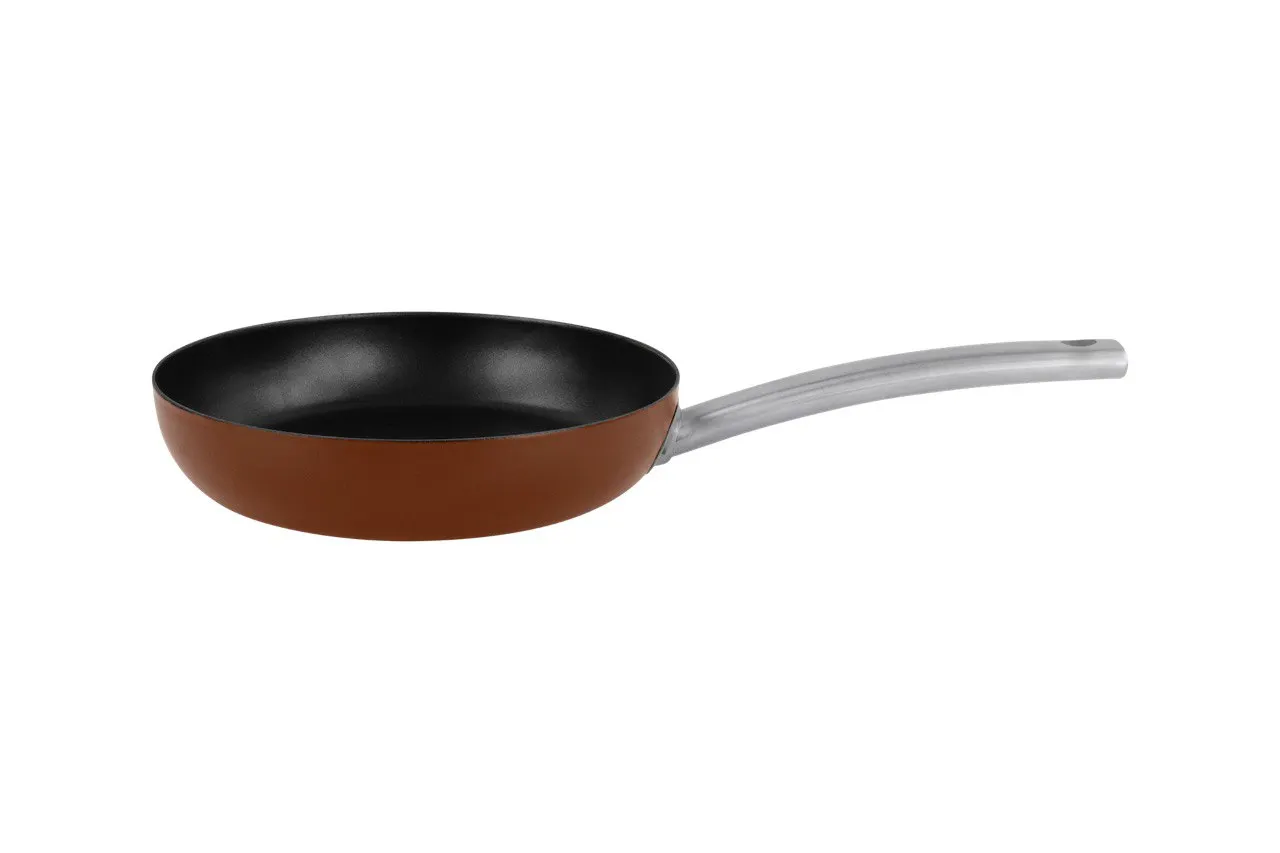 Корпус сковороди виготовлений з високоякісної сталі з вогнетривкою емаллю, випаленою при температурі 840ºC, що надає виробу стійкість до теплових навантажень і механічних пошкоджень. Зовнішнє покриття – глянсове коричневе, що відрізняється стійкістю до вицвітання та забруднень.