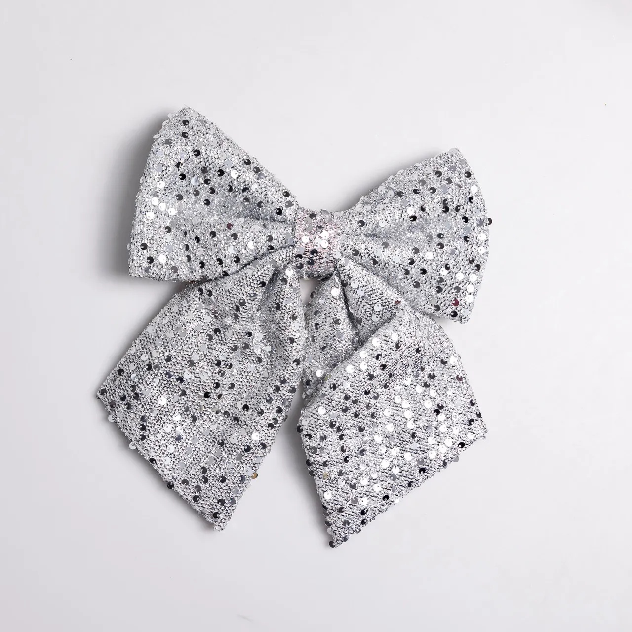 Сріблястий бант з паєтками розміром 25×35 см є яскравим та ефектним елементом святкового декору. Його поверхня прикрашена безліччю дрібних блискучих деталей, які створюють мерехтливий ефект під світлом, що надає виробу особливу виразність та святковий настрій.