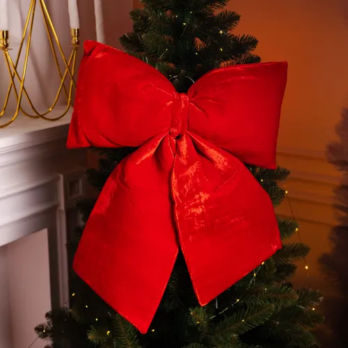 Цей оксамитовий бант червоного кольору має розміри 35×45 см, що робить його помітним та виразним елементом святкового оформлення. Вироблений з щільного оксамиту, він має приємну оксамитову текстуру, яка надає виробу об'єм і акуратну форму.
