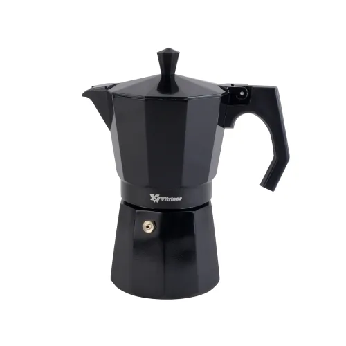 BLACK Гейзерна кавоварка VITRINOR дозволяє готувати каву з насиченим смаком без використання паперових фільтрів. Це заощаджує кошти та робить приготування більш екологічним. Виготовлена з литого алюмінію, вона швидко нагрівається та зберігає тепло, забезпечуючи рівномірне заварювання.