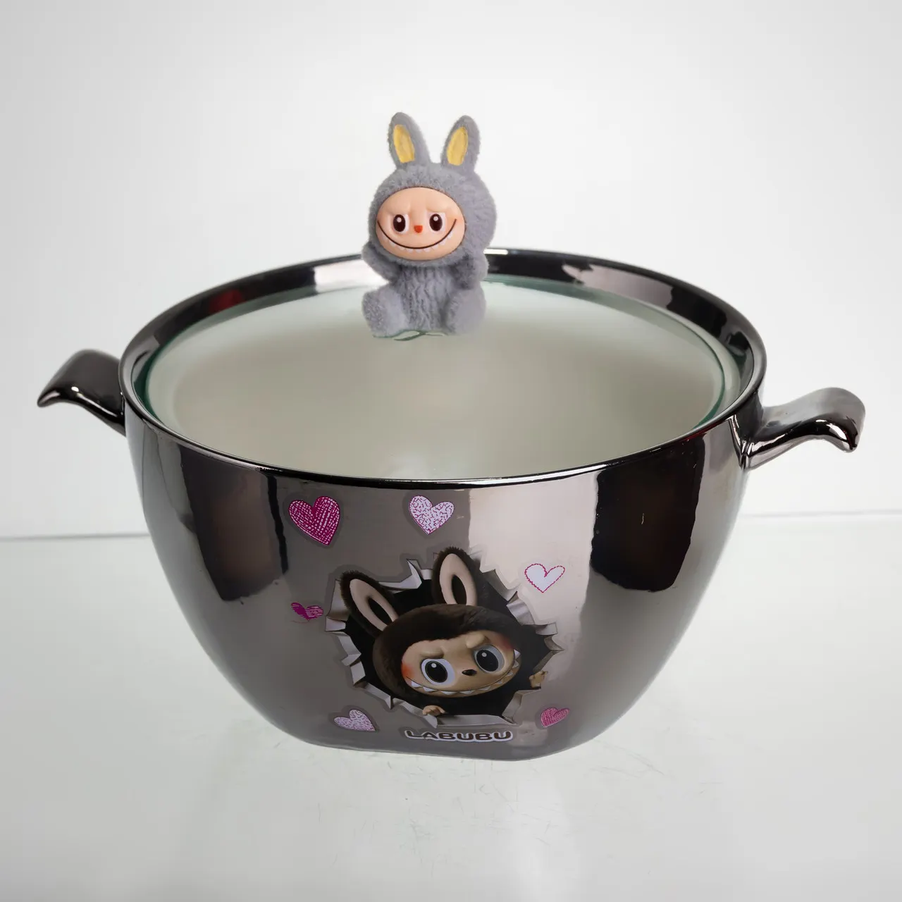 Головною відмінністю є унікальний дизайн із фігуркою персонажа Labubu на кришці, що вирізняє її серед стандартного посуду для супу. Також наявність зручних ручок і скляної кришки підвищує комфорт використання.