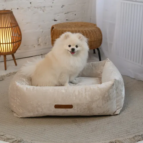 CAPRICE — прямокутний лежак преміум-класу для собак з мармуровим велюром, молочний, S — 40×55×22 см поєднує в собі стильний дизайн, комфорт та довговічність, створюючи ідеальне місце відпочинку для вашого улюбленця. Цей лежак розроблений з урахуванням потреб маленьких собак і власників, які цінують якість і естетику інтер’єру.