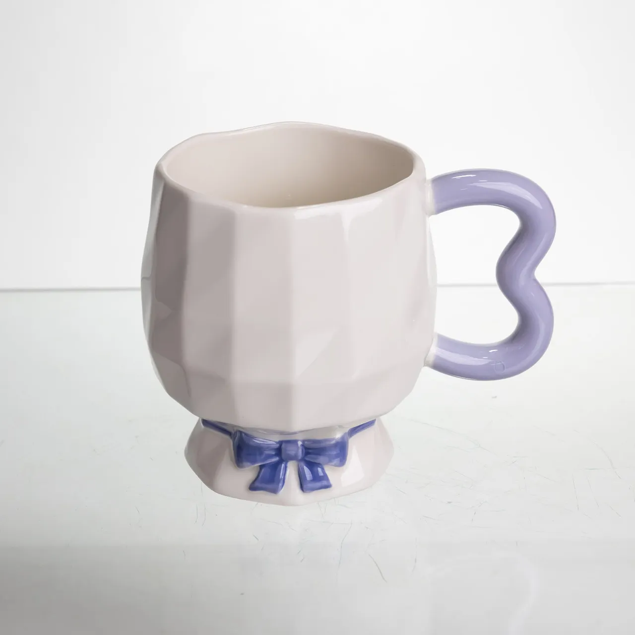 Особливістю моделі є декоративна рельєфна підставка, виконана у вигляді банта, яка плавно переходить у корпус чашки, надаючи виробу вишуканість. Фігурна ручка з витонченими вигинами забезпечує зручний хват, що робить користування чашкою максимально комфортним для користувача.