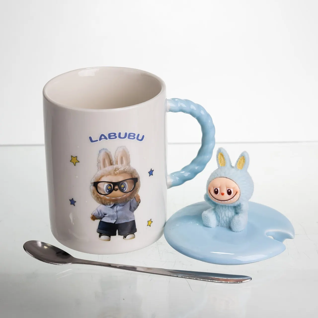 Чашка порцелянова з кришкою і ложкою Labubu 300 (мл) подарункова кружка прикольна чашка для дітей на подарунок Блакитний FM-35B