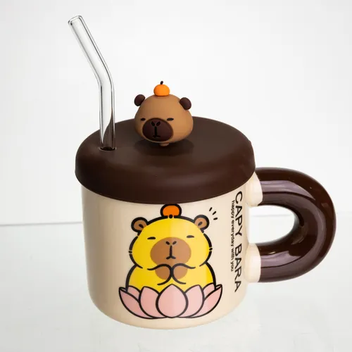 Порцелянова чашка з кришкою та трубочкою об'ємом 400 мл ідеально підійде для тих, хто цінує затишок і оригінальні аксесуари. Основний декор чашки — забавне зображення капібари, доповнене написом «Happy everyday with you». Кольорова гама витримана у м'яких кремово-коричневих тонах, що надає виробу ніжності та тепла. Кришка міцна, щільно закривається, прикрашена міні-фігуркою капібари з апельсинкою, а скляна трубочка додає зручності при вживанні напоїв.