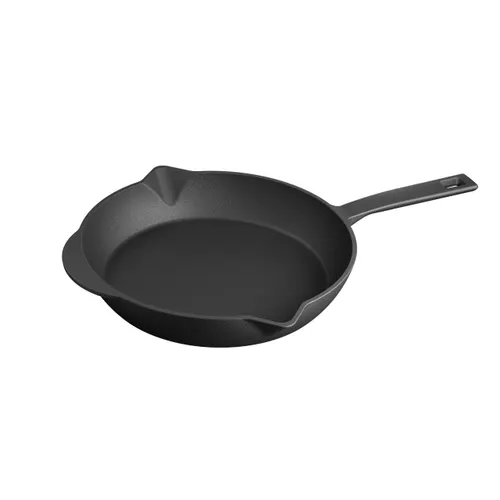 Виготовлена з міцного чавуну, сковорода відзначається довговічністю і здатна витримувати температурні навантаження до 300°C. Її маса становить 3,78 кг, що забезпечує стабільне розміщення на поверхні та рівномірний розподіл тепла. Продумана конструкція з двома сливними носиками забезпечує зручність при контролі виходу соусів та інших рідин прямо під час приготування.