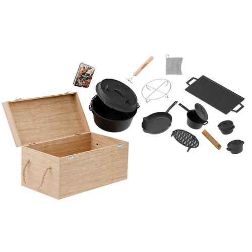| Склад набору | Казан 4.5 л з кришкою-сковородою, сковорода 26 см, деко для гриля 33x23 см, соусник 18 см, 2 міні-казана 11 см, складна решітка 23 см, підставка для соусника, шкіряний чохол для ручки, кільцевий очистник з нержавіючої сталі, металева підставка |