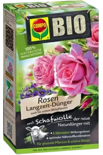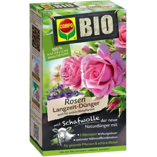 COMPO BIO Тверде органічне добриво довготривалої дії для троянд — це ваш надійний помічник у забезпеченні якісного цвітіння та швидкого росту троянд. Добриво діє протягом 5 місяців після одноразового внесення, що спрощує догляд за рослинами. Особлива формула NPK (азот, фосфор, калій) у співвідношенні 6:3:5 сприяє ефективному харчуванню рослин.
