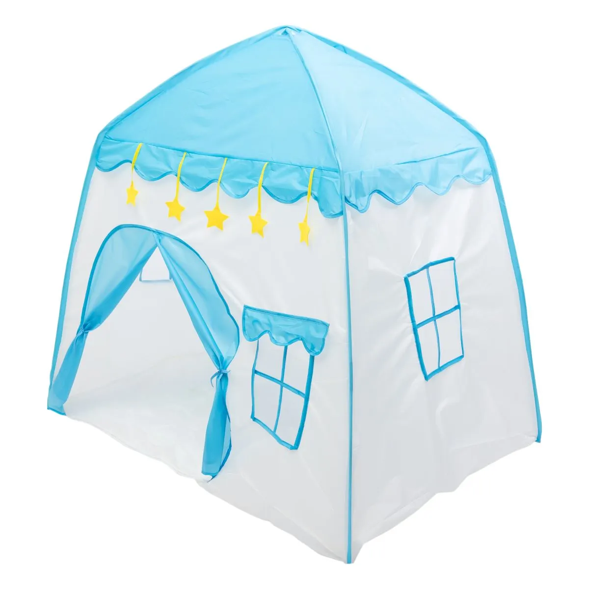 Дитяча ігрова намета будиночок 125×100×120 см представляє собою унікальний простір для ігор і відпочинку дитини. Виготовлена з міцного та легкого матеріалу 100% поліестеру, вона відзначається стійкістю до вологи та сонячних променів, що дозволяє використовувати її як у приміщенні, так і на вулиці. Намет оформлений у ніжних блакитних тонах з милими декоративними елементами: зірочками, хвилястими краями та віконцями з шторами.