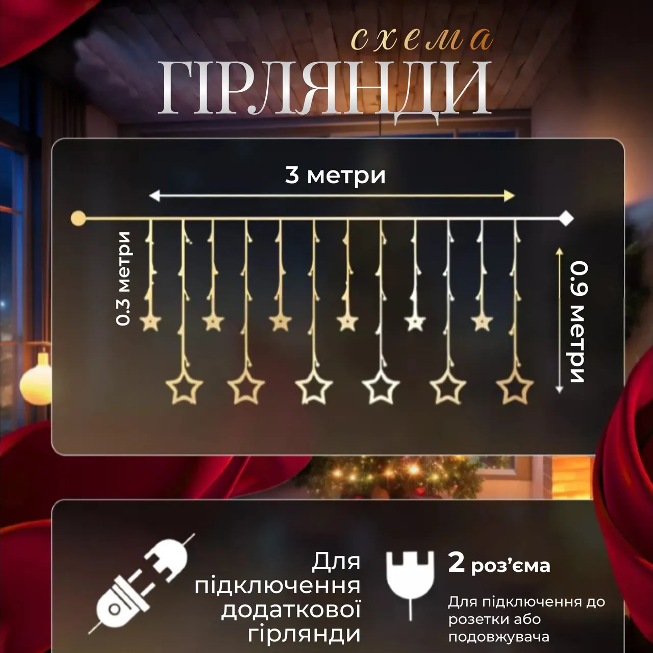 Характеристики "Електрична гірлянда Зірка штора 3 метри на вікно для фотозон жовта WYF11Y"