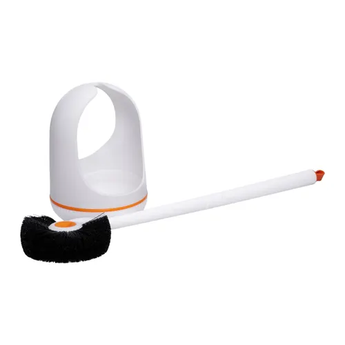 Цей комплект включає туалетний ершик з подовженою ручкою та вертикальний тримач для зручного зберігання після використання. Ручка оснащена петлею для підвішування або комфортного хвата під час чищення. Робоча частина являє собою щетину середньої жорсткості, щільно розташовану для якісного видалення забруднень без пошкодження поверхні.