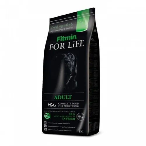Fitmin For Life Adult — - це преміальний корм для дорослих собак усіх порід. Комплексний склад продукту включає 55% протеїнів тваринного походження, з яких 20% — свіже м'ясо курки та яловичини, а 21% — - сушене м'ясо птиці. Це робить корм ідеальним джерелом білка для тварин.