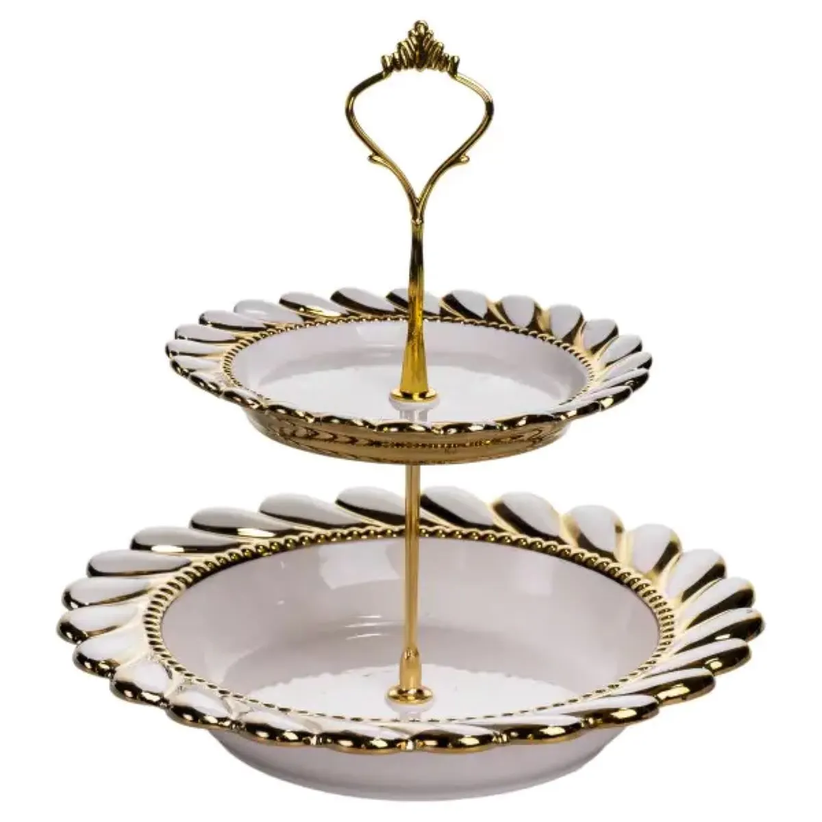 Двоярусна порцелянова фруктовниця Fiora Savoiardi призначена для зручної та охайної подачі фруктів, десертів або випічки. Конструкція складається з двох тарілок, розміщених на металевій позолоченій підставці, що забезпечує стійкість та економить місце на столі. Такий формат підходить для сервірування як у повсякденному використанні, так і під час прийому гостей. Тарілки виготовлені з порцеляни та мають хвилястий край, форма якого нагадує пелюстки квітки. Ця деталь додає виробу виразності, зберігаючи стриманий вигляд. Тонка золота окантовка вздовж краю підкреслює форму тарілок і гармонійно поєднується з позолоченою металевою підставкою. Фруктовниця Fiora Savoiardi підходить для сервірування столу в класичному або сучасному стилі. Вона може використовуватися для подачі фруктів, солодощів, тістечок або закусок. Практичне двоярусне розташування та поєднання порцеляни з металом роблять виріб функціональним елементом столового посуду або доречним подарунком. Характеристики: Тип: двоярусна фруктовниця Бренд: Fiora Savoiardi Матеріал тарілок: порцеляна Кількість тарілок: 2 Форма краю: хвилястий Декор: тонка золота окантовка Підставка: металева, позолочена