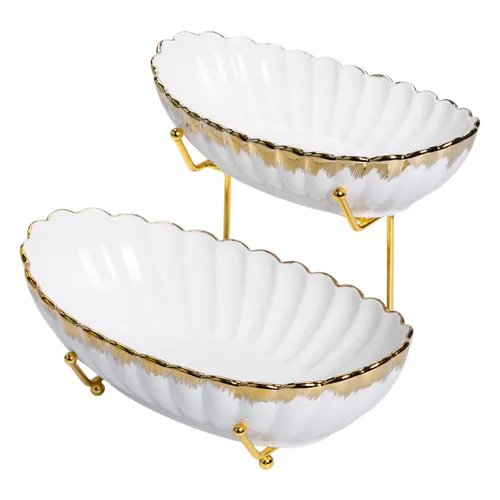 Дво́ярусна фруктівниця HP-26-5 відрізняється продуманим дизайном і функціональністю. Вона виготовлена з білого порцеляни з делікатним золотистим обідком, що надає виробу вишуканий та презентабельний зовнішній вигляд. Металеве підставка золотистого кольору забезпечує стійкість конструкції і додатково прикрашає її, створюючи ефектний акцент на святковому столі.