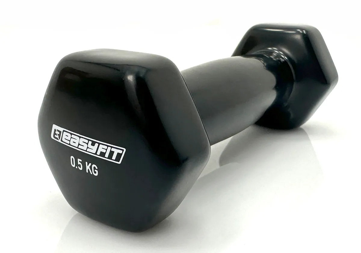 Гантель для фітнесу 0.5 кг EasyFit з вініловим покриттям чорна — ідеальний вибір для тих, хто починає свій фітнес-шлях. Її легка вага дозволяє новим користувачам легко позбутися страху та почати тренування, поступово нарощуючи інтенсивність та навантаження.