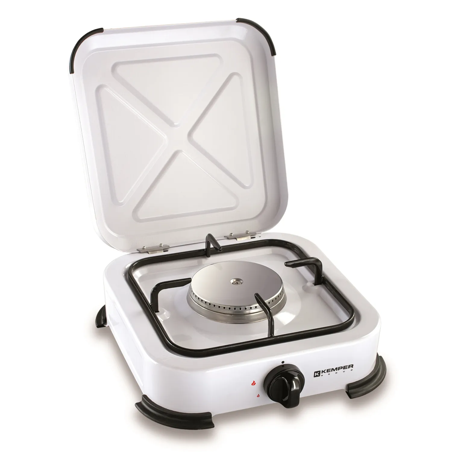 Газова плитка Kemper обладнана стійкими пластиковими ніжками, що дозволяє розміщувати її на різних поверхнях без ризику перевернутися. Фіксований ковпак конфорки робить переміщення плитки безпечним та легким.