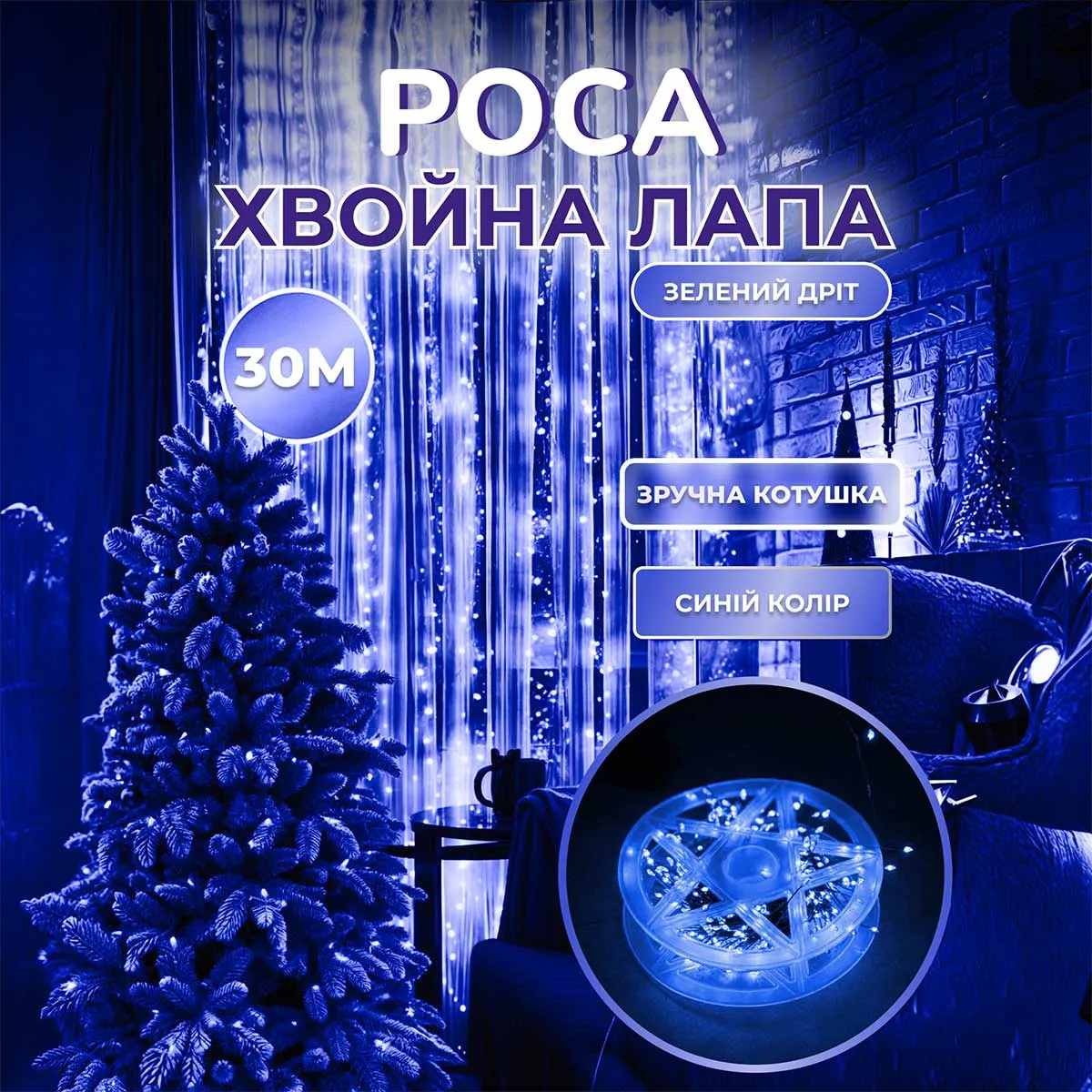 Гірлянда роса мішура хвойна лапа довжиною 30 метрів оснащена 640 світлодіодами з яскравим синім сяйвом. Пристрій виконано з використанням світлодіодів форми краплі, що надає освітленню ефект справжніх крапель роси, які розташовуються на хвої. Зелений провід гармонійно поєднується з природною тематикою, дозволяючи органічно вписати гірлянду у дизайн будь-якої новорічної декорації.