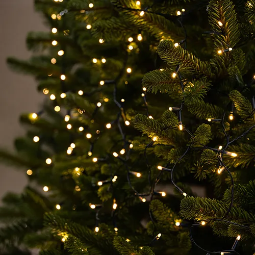 Гірлянда оснащена 1000 LED-лампами жовтого відтінку, які створюють тепле, м’яке світло з кутом огляду 360 градусів. Живлення здійснюється від мережі 220 В за допомогою надійного шнура довжиною 1,09 метра. Відстань від вилки до першої лампочки становить приблизно 1,9 метра, що забезпечує зручність розміщення.