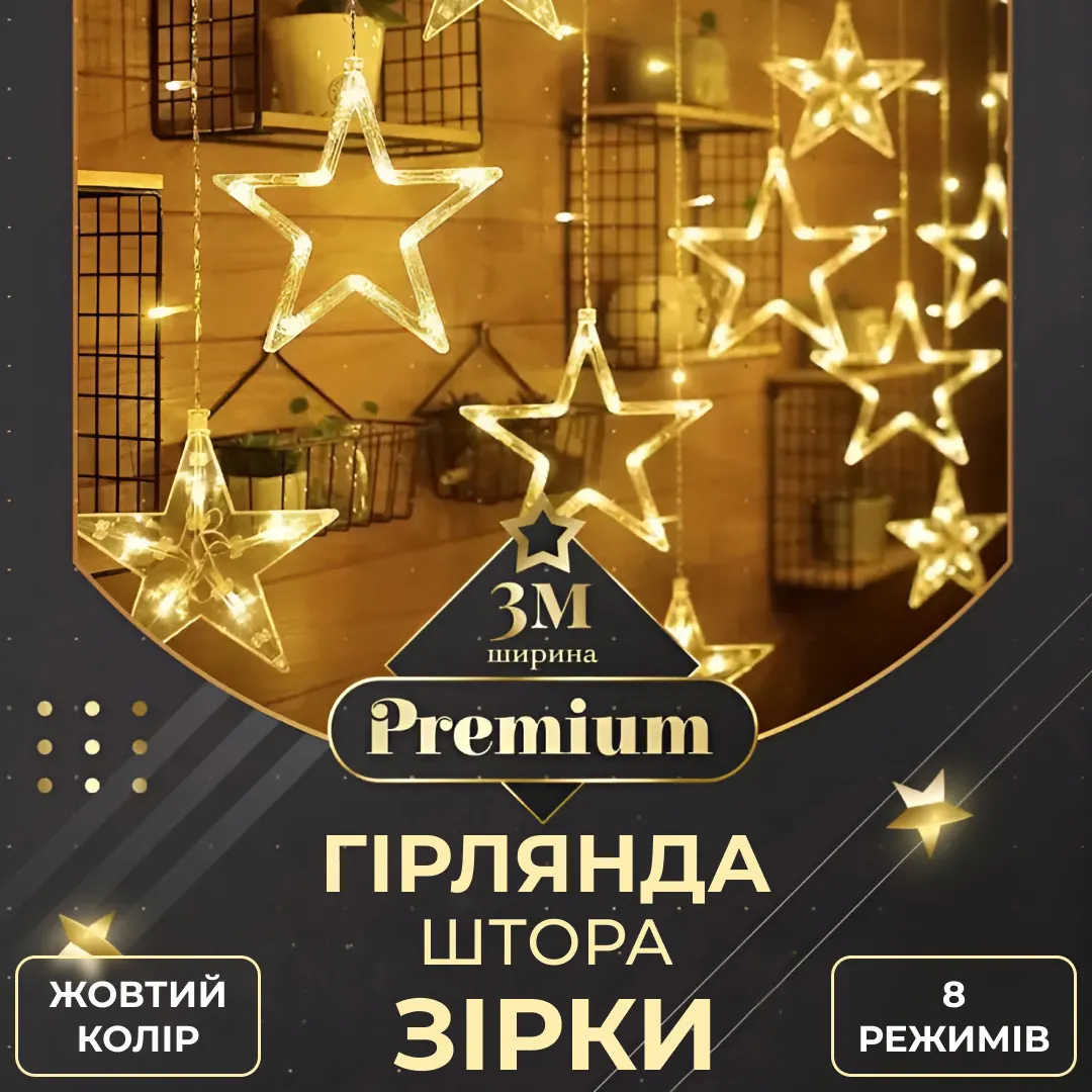 Гірлянда штора 3х0,7 м з 108 світлодіодними лампочками та унікальними елементами у вигляді 6 великих і 6 маленьких зірок ідеально підходить для прикрашання житлових і комерційних приміщень. Оснащена світлодіодами жовтого кольору, така гірлянда створює теплу та затишну атмосферу, додаючи святковості й затишку будь-якому інтер’єру.
