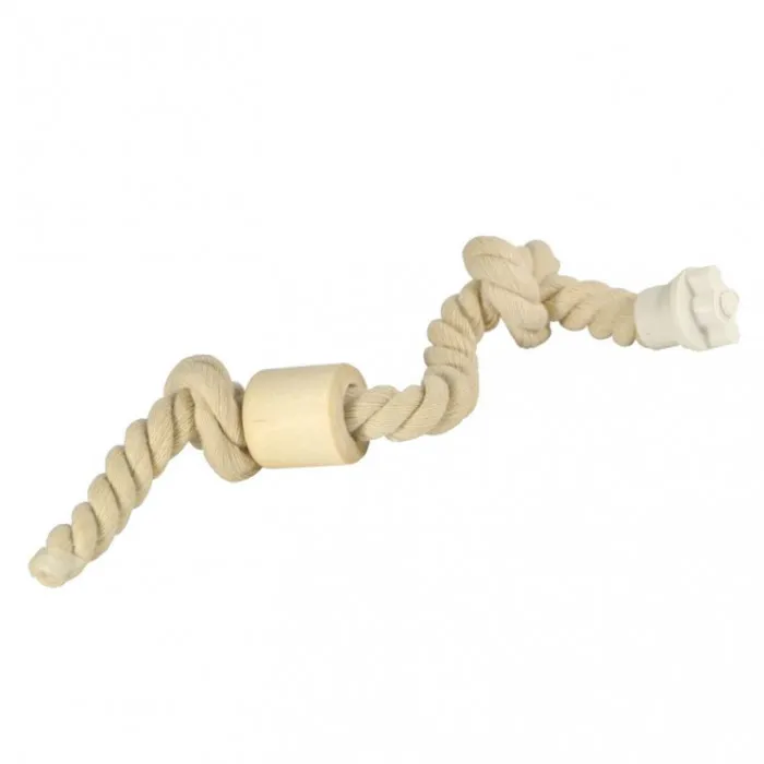 Канат для лазіння на 2 вузли з натуральної бавовни у поєднанні з природною деревиною буде корисною та безпечною розвагою для всіх видів папуг. Діаметр каната становить 14 мм, а довжина — 25 см, що ідеально підходить для більшості клітин. Підвішується в клітині або за її межами за допомогою пластикової клямки, забезпечуючи надійність.