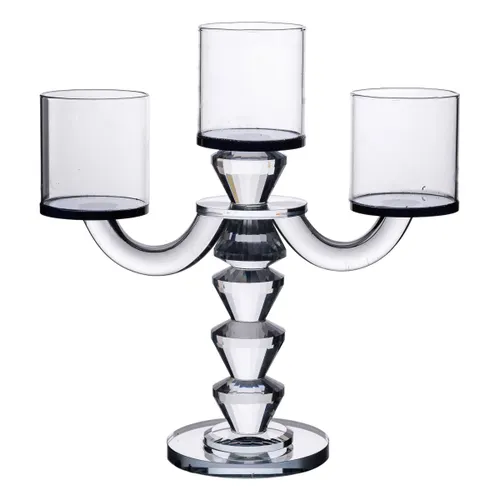 Крім того, цей канделябр відзначається довговічністю і легкістю у догляді: скло можна чистити звичайними засобами для скла без ризику пошкодити поверхню. Контраст чорних і прозорих елементів виділяє виріб на тлі інших декоративних аксесуарів, роблячи його помітним і стильним акцентом, який не втрачає своєї актуальності з часом.