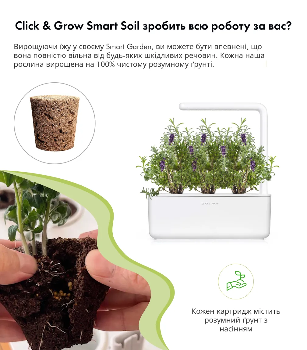 Встановіть картридж у смарт-пот, додайте води, підключіть до мережі — та насолоджуйтесь зростанням вашої лаванди. Простий процес посадки та догляду робить систему Click&Grow ідеальним вибором для садівників-початківців або тих, хто хоче додати трохи зелені в міський інтер'єр.
