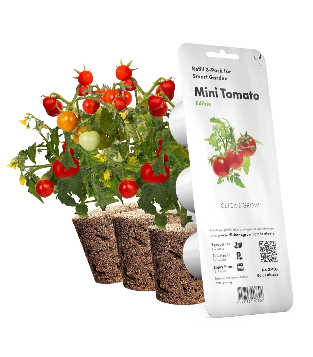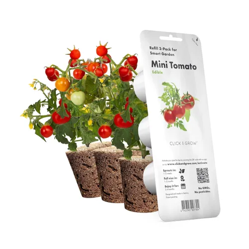 Міні-томати легко виростити у вашій розумній фермі Click&Grow, дотримуючись простих рекомендацій щодо догляду за рослинами. Ці томати ідеально підходять для закусок, салатів, коктейлів та сендвічів. Їхній смак нагадує домашні томати, які виростила ваша бабуся.