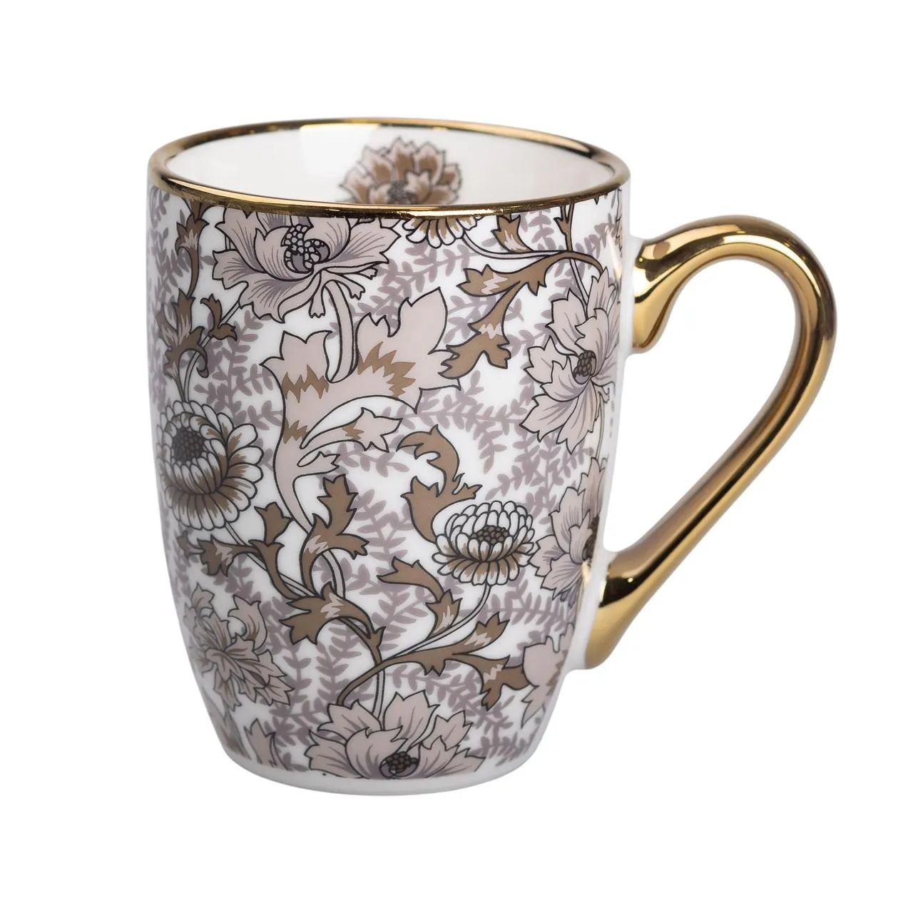 Керамічна кружка об'ємом 400 мл із золотистим обідком і золотою ручкою є стильним та вишуканим предметом посуду, який ідеально підходить для чаювання та кавових пауз. Її коричневий колір і ніжний рослинний декор створюють затишну та елегантну атмосферу на столі. Висота виробу становить 10,5 см, верхній діаметр – 8 см, що забезпечує зручне використання та комфортний хват.
