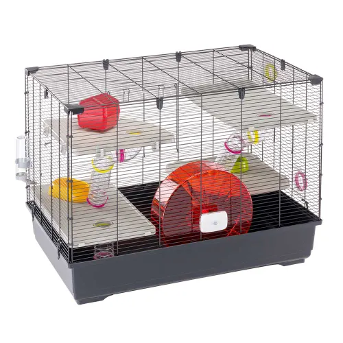 Клітка Village 80 має багаторівневу конструкцію, що сприяє активній грі і вільному пересуванню домашнього гризуна. Кожен рівень з'єднується прозорими тунелями з пластику, що дозволяє тваринці безперешкодно переміщатися між зонами. В комплекті є всі необхідні аксесуари для догляду, включаючи поїлку, кормушку, миску, будиночок і велике колесо для тренувань. Це комплексне рішення для забезпечення комфортного життя хом'яка у вашому домі.