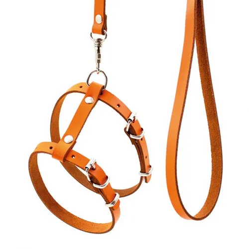 Характеристики "Комплект шкіряний для прогулянки кота / декоративної собачки Шлейка + Повідець "Кот" помаранчевий"
