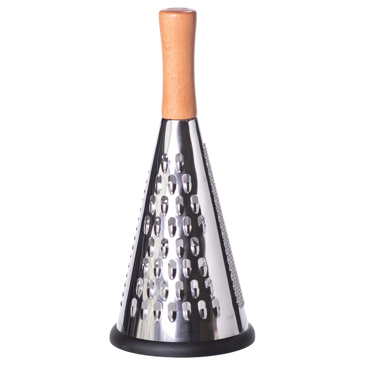 Конусна тристороння терка з зручною дерев'яною ручкою виготовлена з високоякісної нержавіючої сталі, що забезпечує довговічність і надійність у використанні. Цей кухонний аксесуар призначений для швидкого та ефективного подрібнення різних продуктів, включаючи овочі, сир, фрукти та шоколад, завдяки трьом робочим поверхням із різним типом лез.