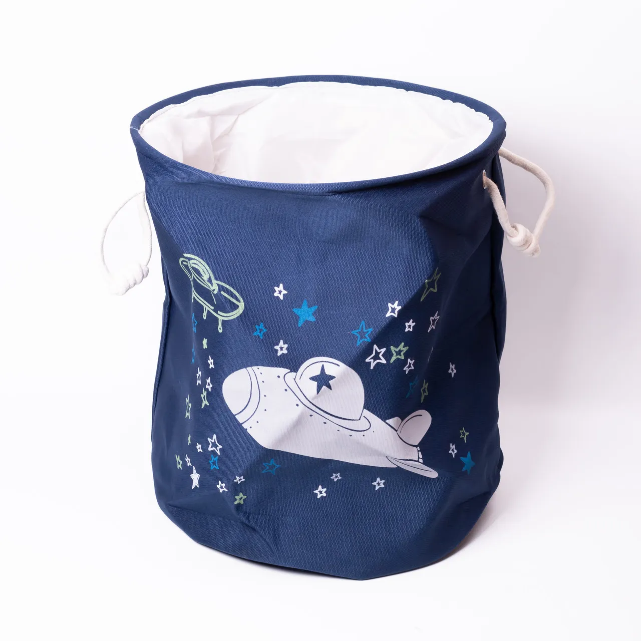 Відсутність кришки — ще одна важлива особливість, що робить процес використання максимально зручним і швидким для дітей. Матеріал корпусу — тканина — забезпечує гнучкість конструкції і простоту охайного зберігання, на відміну від жорстких кошиків із пластику чи металу.