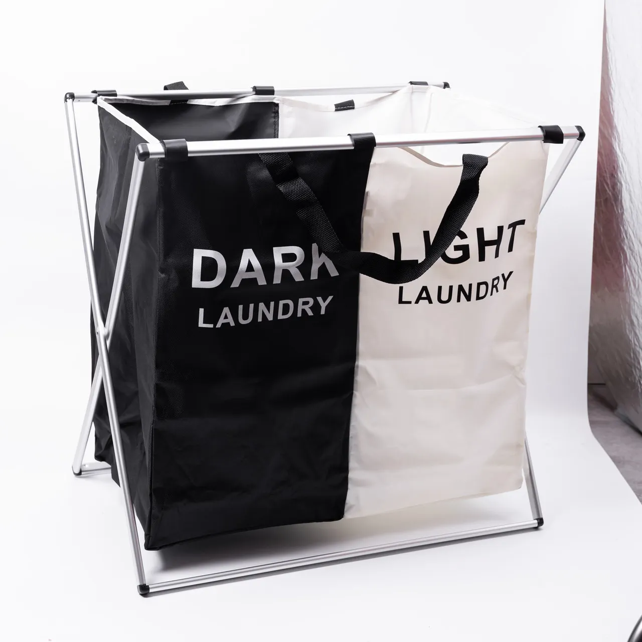 Два відділення в кошику дозволяють ефективно розділяти світлу і темну білизну, що спрощує підготовку до прання і запобігає ризику забарвлення речей. Складана конструкція з Х-подібною алюмінієвою рамою забезпечує стійкість і стійке положення навіть при максимальному завантаженні.