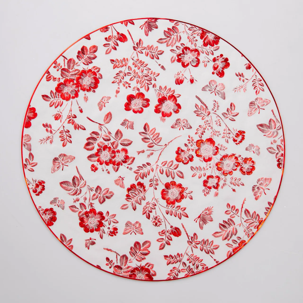 Цей круглий плейсмат має вишуканий дизайн у червоному кольорі з золотистими акцентами, що надає сервіровці вишуканого вигляду. Завдяки діаметру 38 см виріб ідеально підходить для розміщення стандартних тарілок і приборів, забезпечуючи акуратність і захист поверхні столу.