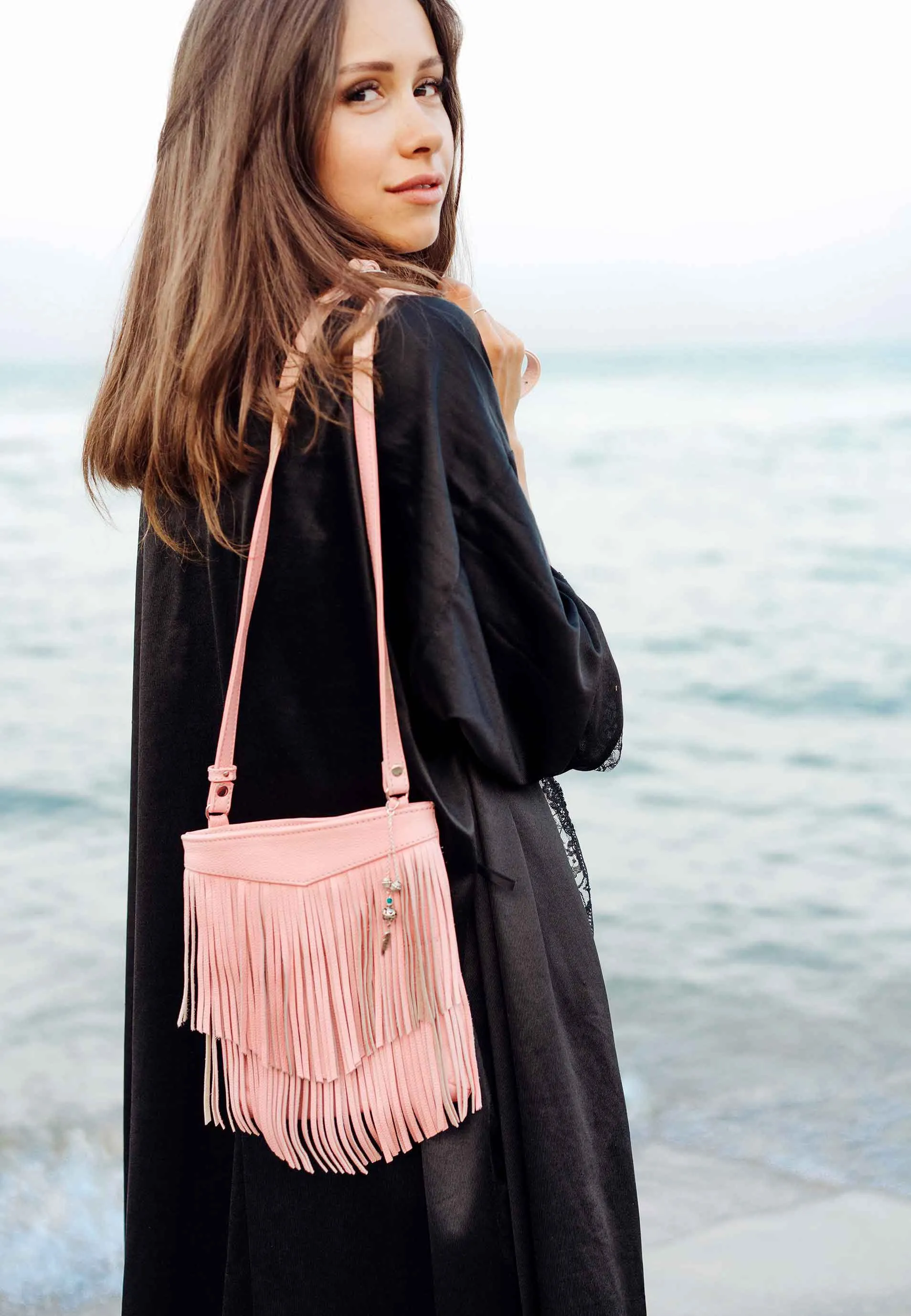 Шкіряна жіноча сумка з бахромою міні-кроссбоді Fleco рожева
