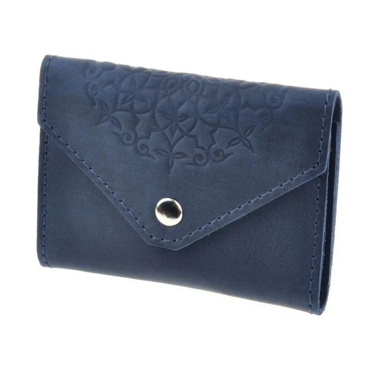 Кард-кейс 3.0 виконаний з натуральної шкіри Crazy Horse синього кольору та прикрашений оригінальною мандалою. Його розміри становлять 10,5 х 8 см, що дозволяє зручно розміщувати його в кишені, дамській сумці або діловому портфелі. Цей аксесуар призначений для акуратного зберігання візитних та дисконтних карток, завдяки чому всі важливі картки завжди будуть під рукою та в порядку.