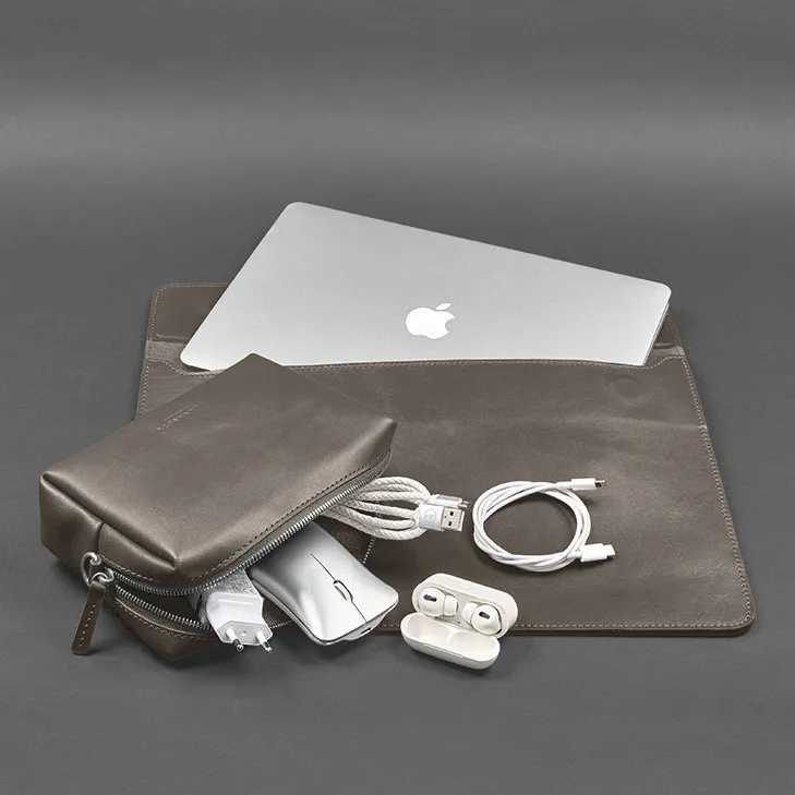 Шкіряний набір Мобільний Універсальний темно-бежевий є ретельно продуманим комплектом аксесуарів, призначений для зручної організації та надійного захисту вашого ноутбука та супутніх пристроїв. У комплект входять два основні елементи: стильний чохол для ноутбука, виготовлений з натуральної шкіри, та функціональний несесер для зберігання проводів та мишки. Це ідеальний вибір для тих, хто цінує якість та естетику у поєднанні з практичністю.