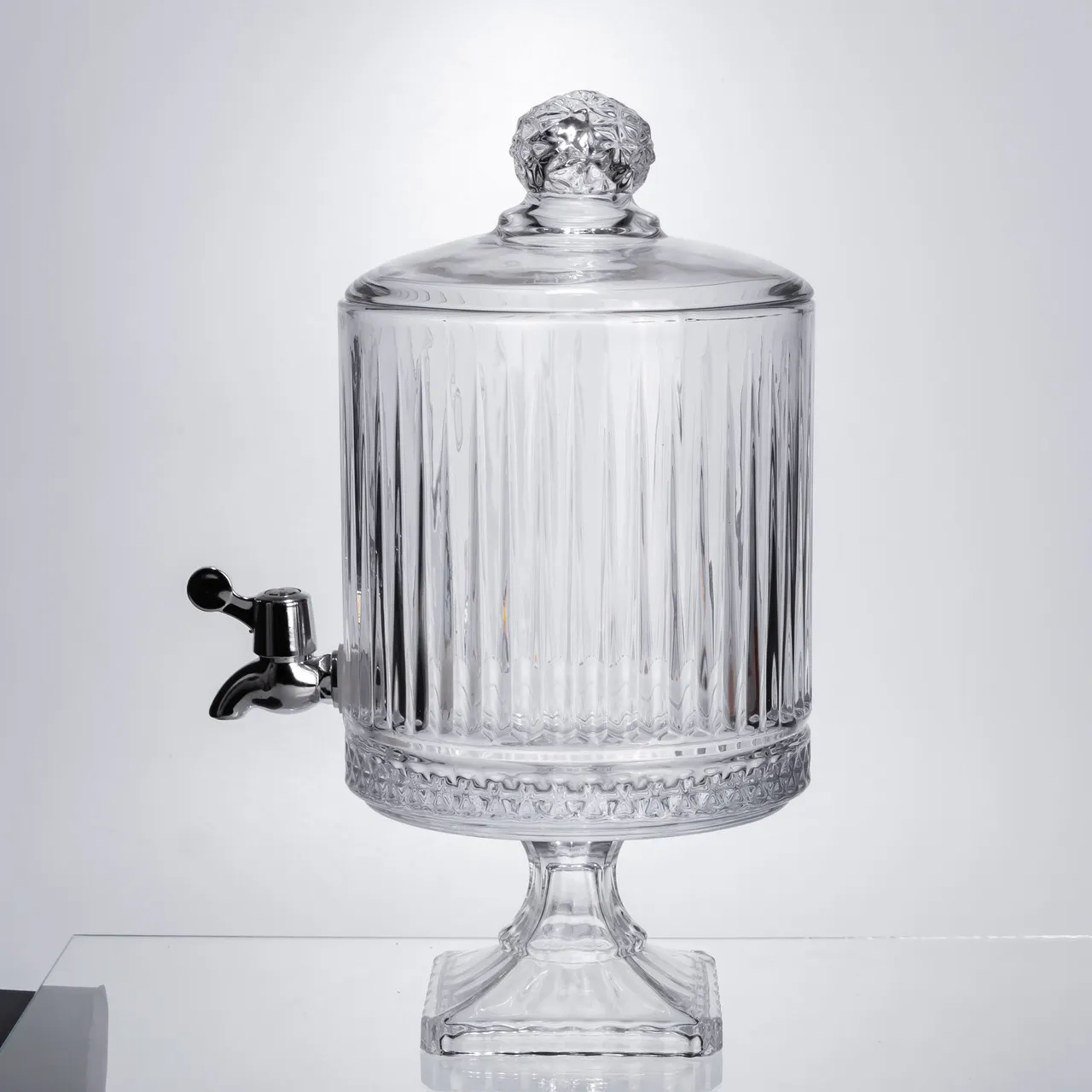Ця лимонадниця відрізняється поєднанням міцності та естетики. Товсте скло забезпечує довговічність і стійкість, а оригінальний рельєфний дизайн прекрасно підтримує стиль вінтаж і святкової сервірування.