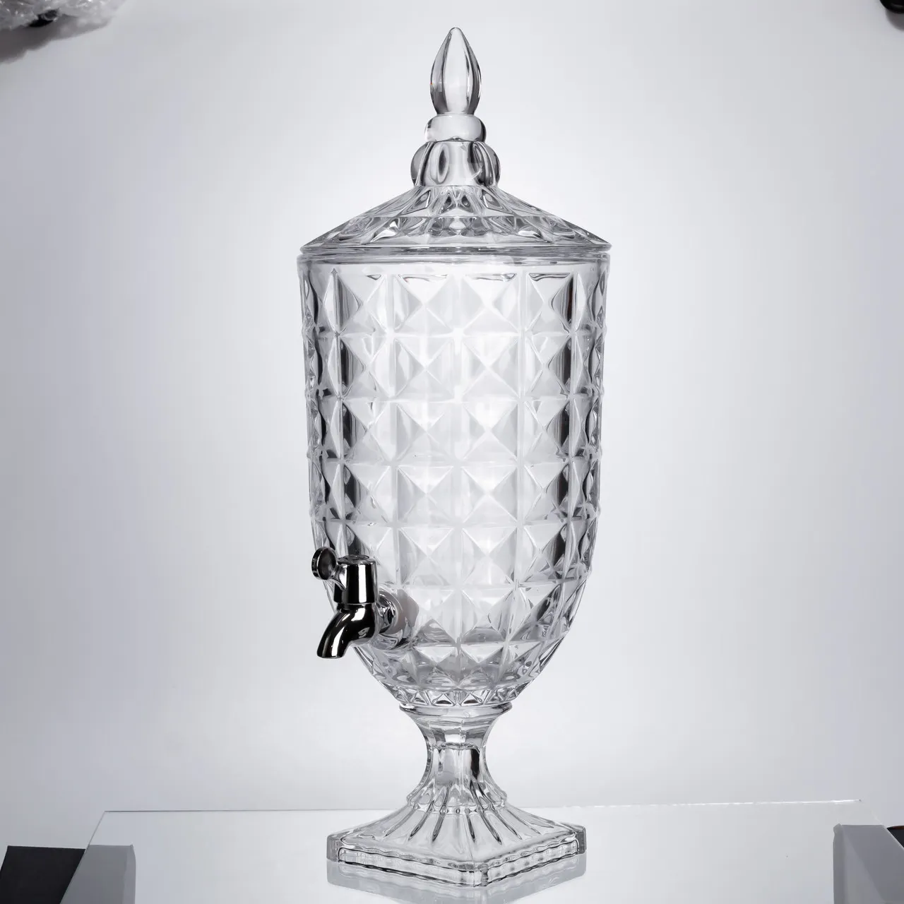 Лимонадниця з краном на підставці зі скла об'ємом 5 літрів представляє собою ефективне та практичне рішення для подачі напоїв в будь-яких умовах — вдома, на святі чи фуршеті. Висота виробу становить 51 см, що забезпечує місткість для великої кількості освіжаючих напоїв.