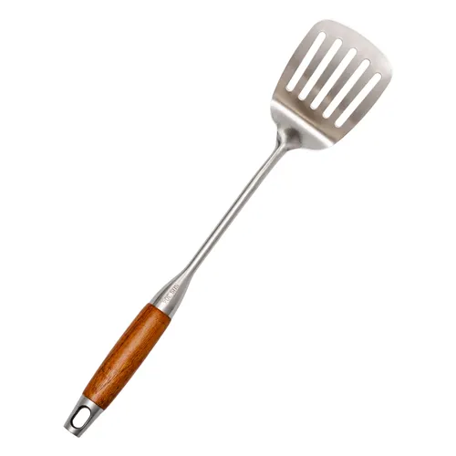 Робоча частина виготовлена з нержавіючої сталі, що має високу термостійкість і стійкість до деформацій при температурному впливі. Дерев’яна ручка спеціально розроблена для комфортного захоплення, не нагрівається і запобігає опікам під час готування. Загальна довжина інструмента становить 39 см, що дозволяє працювати з гарячими поверхнями, зберігаючи безпечну дистанцію.