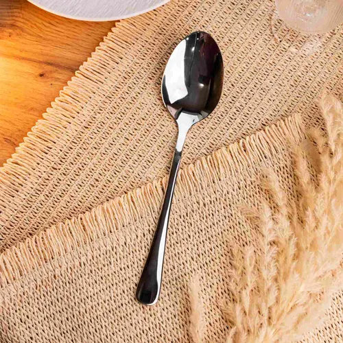Професійний кухонний інструмент збільшеного розміру, призначений для роздачі страв та сервірування столу. Дизайн ложки виконаний у класичному стилі із дзеркальним поліруванням, що робить її універсальним доповненням до будь-якого набору столових приладів. Особливості: Матеріал: Якісна харчова нержавіюча сталь Має підвищену міцність і стійкість до корозії, не вступає в реакцію з гарячими стравами і не змінює їх смак. Довжина 26 см і глибокий місткий черпак дозволяють зручно накладати гарніри, салати, м'ясні страви та соуси із загального посуду. Дзеркальний фініш: Ідеально гладка глянсова поверхня всієї ложки надає їй презентабельного вигляду і значно спрощує гігієнічний догляд. Довговічність: Товщина стали розрахована на інтенсивне використання – ложка не гнеться та зберігає форму при сервіруванні щільних страв. Характеристики: Матеріал: нержавіюча сталь Довжина: 26 см Вага: 100 г