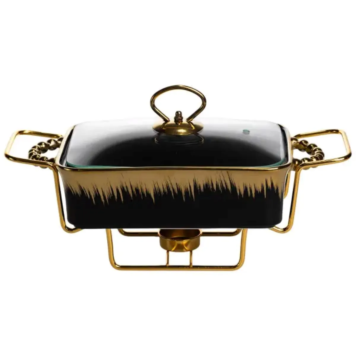 Мармітниця порцелянова прямокутної форми призначена для подачі та підтримання температури готових страв під час сервірування. Лаконічне поєднання чорного кольору з золотистим оздобленням по краях робить виріб доречним як для домашнього використання, так і для банкетів, кейтерингу або ресторанного формату. Прямокутна форма зручна для розміщення на столі та раціонального використання простору. Мармітниця виготовлена з порцеляни, що добре утримує тепло та підходить для подачі гарячих страв. Прозора скляна кришка дозволяє контролювати вміст без необхідності відкривання, зменшуючи втрату тепла. Кришка щільно прилягає, що допомагає зберігати температуру та зовнішній вигляд страви протягом усього часу подачі. Металева підставка оснащена місцями для свічок-таблеток, які забезпечують рівномірний підігрів без підключення до електромережі. Такий формат зручний для виїзних заходів і фуршетів. Конструкція стійка, проста в догляді та розрахована на багаторазове використання в умовах інтенсивної експлуатації. Характеристики: Тип виробу: мармітниця Форма: прямокутна Матеріал чаші: порцеляна Колір чаші: чорний Оздоблення: золотисте по краях Кришка: скляна, прозора Підставка: металева Тип підігріву: від свічок-таблеток