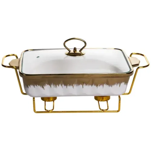 Мармітниця має прямокутну форму з білої порцеляни. Уздовж верхнього краю розташоване тонке золоте оздоблення, яке підкреслює контур і додає завершеності. Конструкція встановлена на металевій підставці золотого кольору, що забезпечує стійкість і дозволяє використовувати свічки для підігріву. Основний матеріал - гладка біла порцеляна, прикрашена золотим орнаментом по краю. Візерунок стриманий, симетричний, без надмірного декору, що робить виріб універсальним для різних стилів сервірування. Скляна кришка прозора, з металевою ручкою золотого кольору, що гармонійно поєднується з підставкою та оздобленням. Мармітниця призначена для подачі гарячих страв із підтриманням їхньої температури. Металева підставка дозволяє розмістити підігрівальні елементи, а скляна кришка зберігає тепло й аромат, водночас даючи змогу бачити вміст. Порцеляна стійка до високих температур і легко очищується після використання, що робить виріб практичним у щоденному застосуванні та під час святкових подій. Характеристики Тип: мармітниця порцелянова Матеріал: порцеляна Підставка: металева, золотого кольору Кришка: скляна з металевою ручкою
