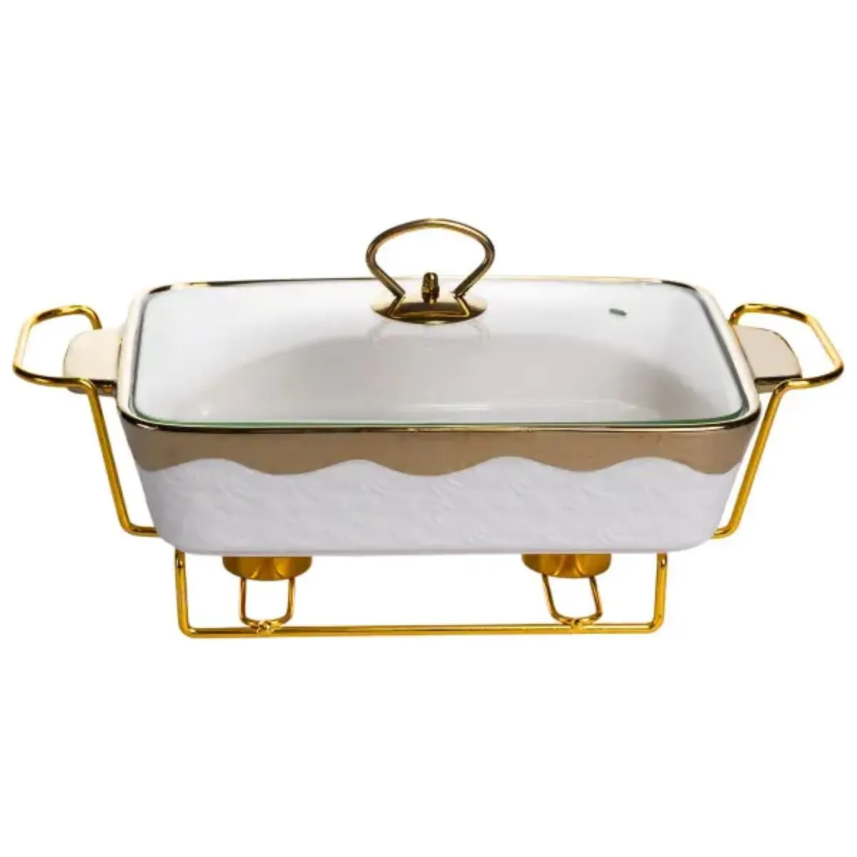 Марміт порцеляновий на металевій підставці з підігрівом — практичне рішення для подачі гарячих страв удома або під час заходів. Завдяки конструкції з підставкою та місцем для свічок-таблеток страва довше залишається теплою без підключення до електрики. Скляна кришка дозволяє контролювати вміст без необхідності відкривати ємність. Порцелянова чаша об’ємом 1,5 л підходить для супів, гарнірів, соусів або других страв. Металева підставка золотистого кольору забезпечує стійкість та витримує вагу виробу разом із вмістом. Компактні розміри дозволяють зручно розмістити марміт на столі, не займаючи зайвого простору. Модель розрахована на використання з двома свічками-таблетками, що забезпечує рівномірне підтримання температури. Конструкція легко розбирається для миття та зберігання. Підходить для щоденного використання або сервірування під час свят. Характеристики: Матеріал чаші: порцеляна Матеріал кришки: скло Матеріал підставки: метал Колір підставки: золотистий Об’єм: 1,5 л Висота: 15,5 см Ширина: 19 см Довжина: 35,5 см Вага: 2,16 кг Джерело підігріву: 2 свічки-таблетки
