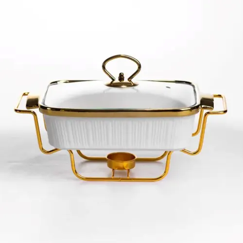 Порцелянова мармітниця об’ємом 1 л призначена для подачі гарячих страв із підтриманням температури під час сервірування столу. Прямокутна форма зручна для розміщення основних страв, гарнірів або запіканок. Скляна кришка дозволяє контролювати вміст без відкривання, що допомагає зберігати тепло та зовнішній вигляд подачі. Конструкція передбачає металеву підставку із місцем для однієї свічки-таблетки, яка забезпечує м’який підігрів. Такий формат підходить для використання вдома або під час святкових подій, коли важливо довше зберігати температуру страв без повторного розігріву. Компактні габарити дозволяють зручно розмістити мармітницю на столі без зайвого навантаження простору. Поєднання порцелянової ємності, скляної кришки та металевої підставки формує практичний варіант для подачі. Виріб легко очищується після використання та підходить для регулярного застосування. Такий формат подачі допомагає організувати стіл більш впорядковано та підтримувати температуру страв протягом усього приймання їжі. Характеристики: Об’єм: 1 л Форма: прямокутна Матеріал ємності: порцеляна Кришка: скляна Підставка: металева Тип підігріву: від однієї свічки-таблетки Висота: 11 см Ширина: 16 см Довжина: 31 см Вага: 1,7 кг