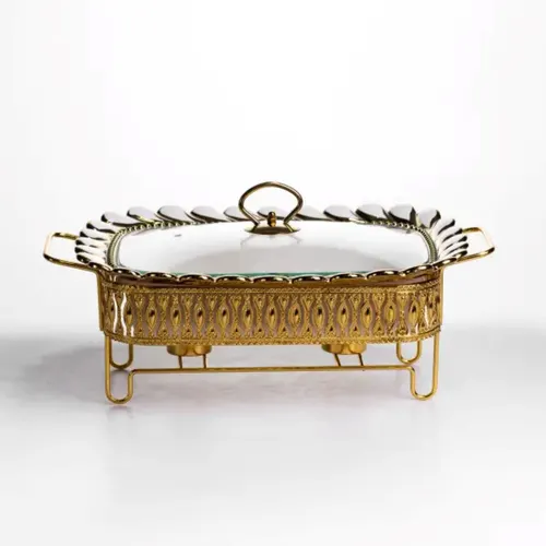 Мармітниця порцелянова Tiffany об’ємом 1.5 л призначений для підтримання температури готових страв під час подачі. Завдяки конструкції з металевою підставкою та можливістю використання свічок-таблеток, він дозволяє зберігати тепло без підключення до електромережі. Такий формат зручний для сервірування столу вдома, на святкових заходах або у закладах громадського харчування. Основна ємність виготовлена з порцеляни, що забезпечує стійкість до температурних змін і простоту в догляді. Скляна кришка дозволяє контролювати вміст без необхідності відкривання, що допомагає мінімізувати втрату тепла. Металева підставка виконує функцію тримача та забезпечує місце для розміщення джерела підігріву, що рівномірно підтримує температуру страви. Конструкція марміта передбачає компактні габарити, що робить його зручним для розміщення навіть на невеликих столах. Поєднання матеріалів — порцеляни, скла та металу — забезпечує практичність у використанні та сумісність із різними форматами сервірування. Підходить для подачі перших і других страв, гарнірів або соусів. Характеристики: Тип: марміт Колекція: Tiffany Матеріал ємності: порцеляна Кришка: скляна Підставка: металева Джерело підігріву: свічки-таблетки Об’єм: 1.5 л Висота: 7 см Ширина: 26 см Довжина: 34 см Вага: 2.5 кг