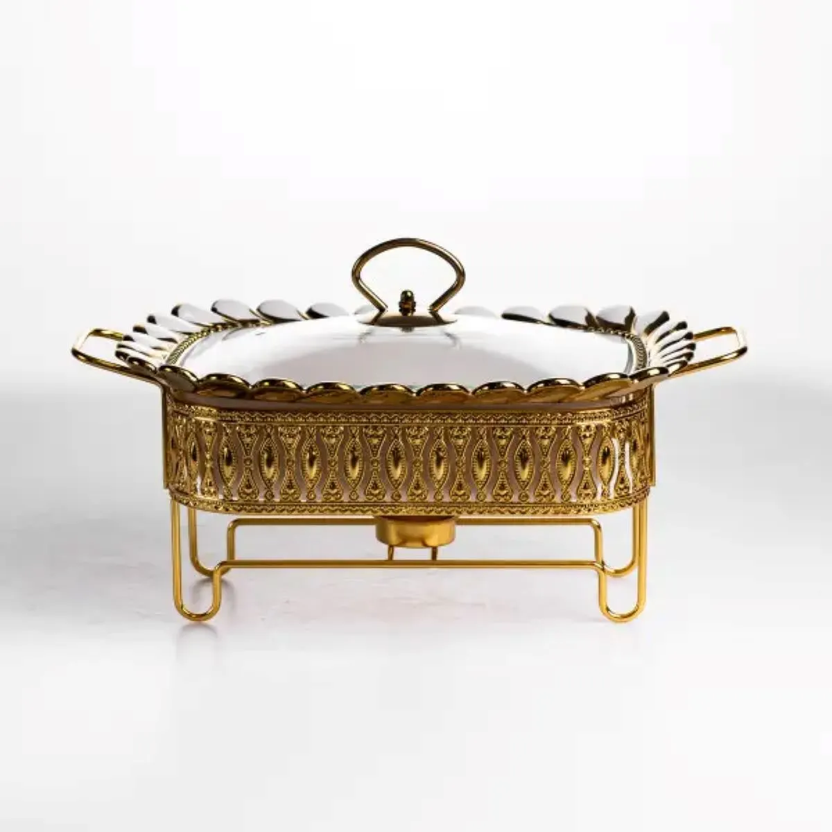 Мармітниця порцелянова Tiffany об’ємом 1 л призначений для підтримання температури готових страв під час подачі. Завдяки конструкції з металевою підставкою та можливістю використання свічок-таблеток, він дозволяє зберігати тепло без підключення до електромережі. Такий формат зручний для сервірування столу вдома, на святкових заходах або у закладах громадського харчування. Основна ємність виготовлена з порцеляни, що забезпечує стійкість до температурних змін і простоту в догляді. Скляна кришка дозволяє контролювати вміст без необхідності відкривання, що допомагає мінімізувати втрату тепла. Металева підставка виконує функцію тримача та забезпечує місце для розміщення джерела підігріву, що рівномірно підтримує температуру страви. Конструкція марміта передбачає компактні габарити, що робить його зручним для розміщення навіть на невеликих столах. Поєднання матеріалів — порцеляни, скла та металу — забезпечує практичність у використанні та сумісність із різними форматами сервірування. Підходить для подачі перших і других страв, гарнірів або соусів. Характеристики: Тип: марміт Колекція: Tiffany Матеріал ємності: порцеляна Кришка: скляна Підставка: металева Джерело підігріву: свічки-таблетки Об’єм: 1 л Висота: 7 см Ширина: 23 см Довжина: 28 см Вага: 1.8 кг
