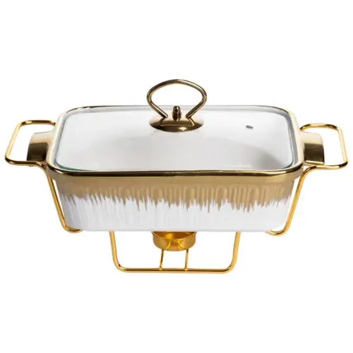Мармітниця порцелянова прямокутної форми виконана в білому кольорі з акуратним золотим оздобленням по краях. Такий дизайн підходить для сервірування гарячих страв у домашніх умовах, на святкових подіях або в закладах громадського харчування. Прямокутна форма дозволяє зручно розмістити виріб на столі та ефективно використовувати простір. Мармітниця виготовлена з порцеляни, що сприяє рівномірному збереженню тепла. Прозора скляна кришка забезпечує візуальний контроль страви без необхідності відкривання, що допомагає підтримувати температуру та охайний вигляд подачі. Кришка легко знімається та зручна для щоденного використання. Мармітниця встановлена на золотистій металевій підставці з підігрівом від свічок-таблеток. Такий спосіб нагріву не потребує підключення до електромережі та підходить для фуршетів, банкетів і виїзних заходів. Конструкція стійка та розрахована на багаторазове використання. Характеристики: Тип виробу: мармітниця Форма: прямокутна Матеріал чаші: порцеляна Колір: білий Оздоблення: золоте Кришка: скляна, прозора Матеріал підставки: метал Колір підставки: золотистий Тип підігріву: від свічок-таблеток